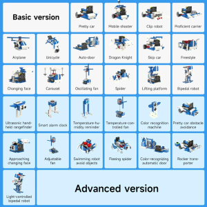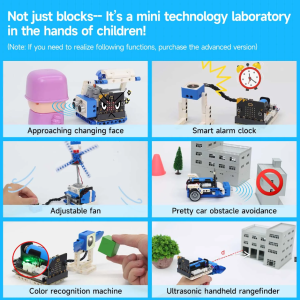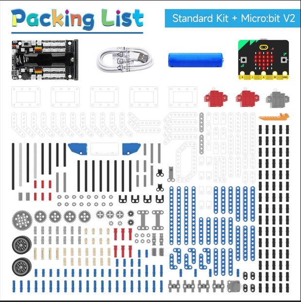 Bộ khối xây dựng lập trình siêu kit 16 trong 1 được thiết kế dựa trên BBC Micro:bit, bao gồm bảng mở rộng Super:bit, servo/động cơ khối xây dựng, pin và 358 bộ phận khối xây dựng.